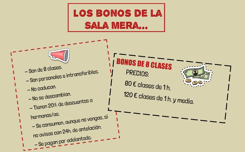 La escuela de la Sala Mera establece un precio por bonos de clases de forma que las familias pueden pagar un bono de 8 clases de una hora por 80 euros o de una hora y media por 120 euros. Los bonos son personales e intransferibles y se establece un descuento del 20 por ciento para hermanos.