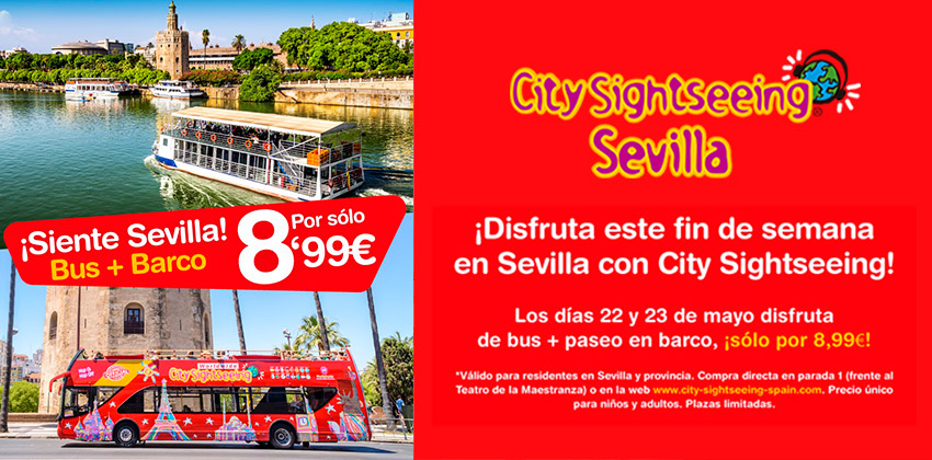 Esta promoción es válida solo para este sábado 22 y domingo 23 de mayo, se podrá adquirir en la parada 1 de City Sightseeing (junto a la Torre del Oro) y no es acumulable a otras promociones.